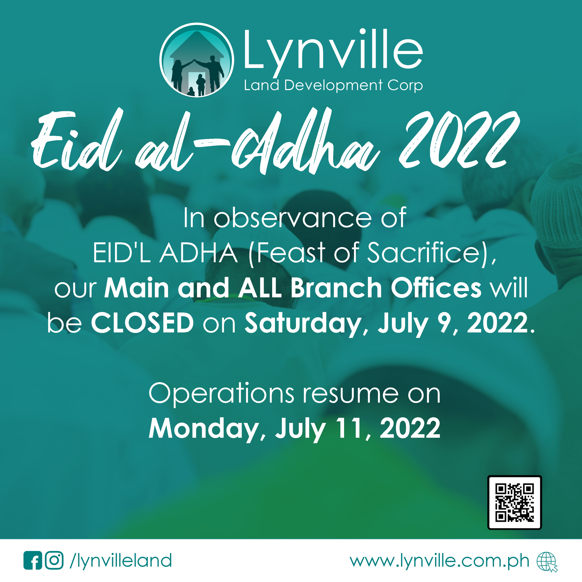 Dear clients, agents, and brokers please be informed that in observance of EID’L ADHA (Feast of Sacrifice), our Main and ALL Branch Offices will be CLOSED on Saturday, July 9, 2022.