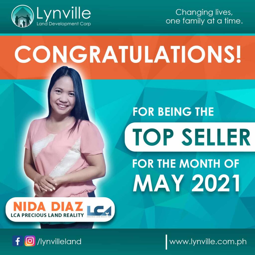 Our warmest congratulations to Ms. Nida Diaz of LCA Precious Land Realty Inc. for being our TOP SELLER for the month of MAY 2021 and to LYNVILLE INHOUSE PIONEER (Real estate sellers with persistence and determination) for being the TOP BROKER GROUP for the month of MAY 2021.
